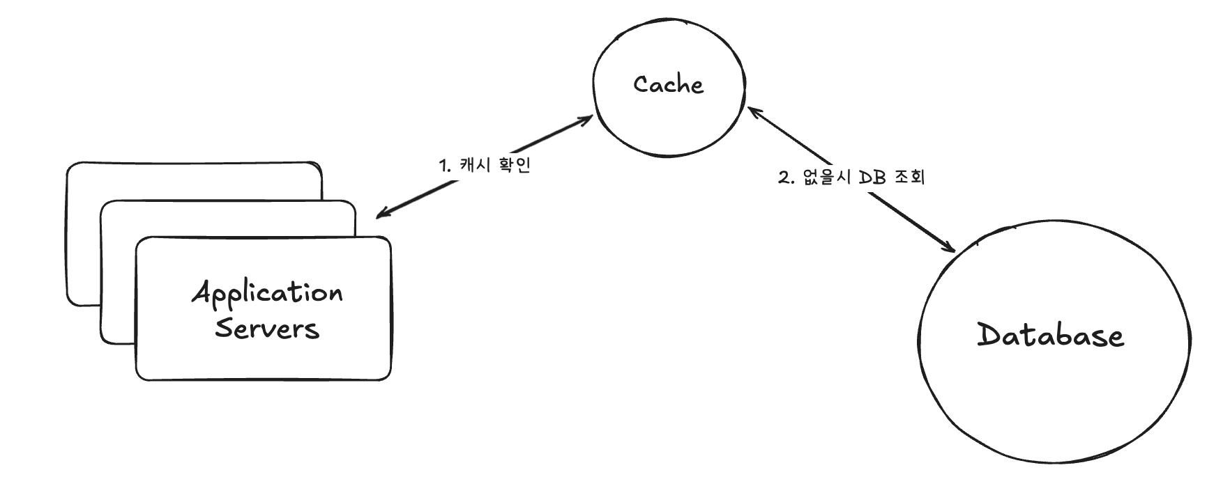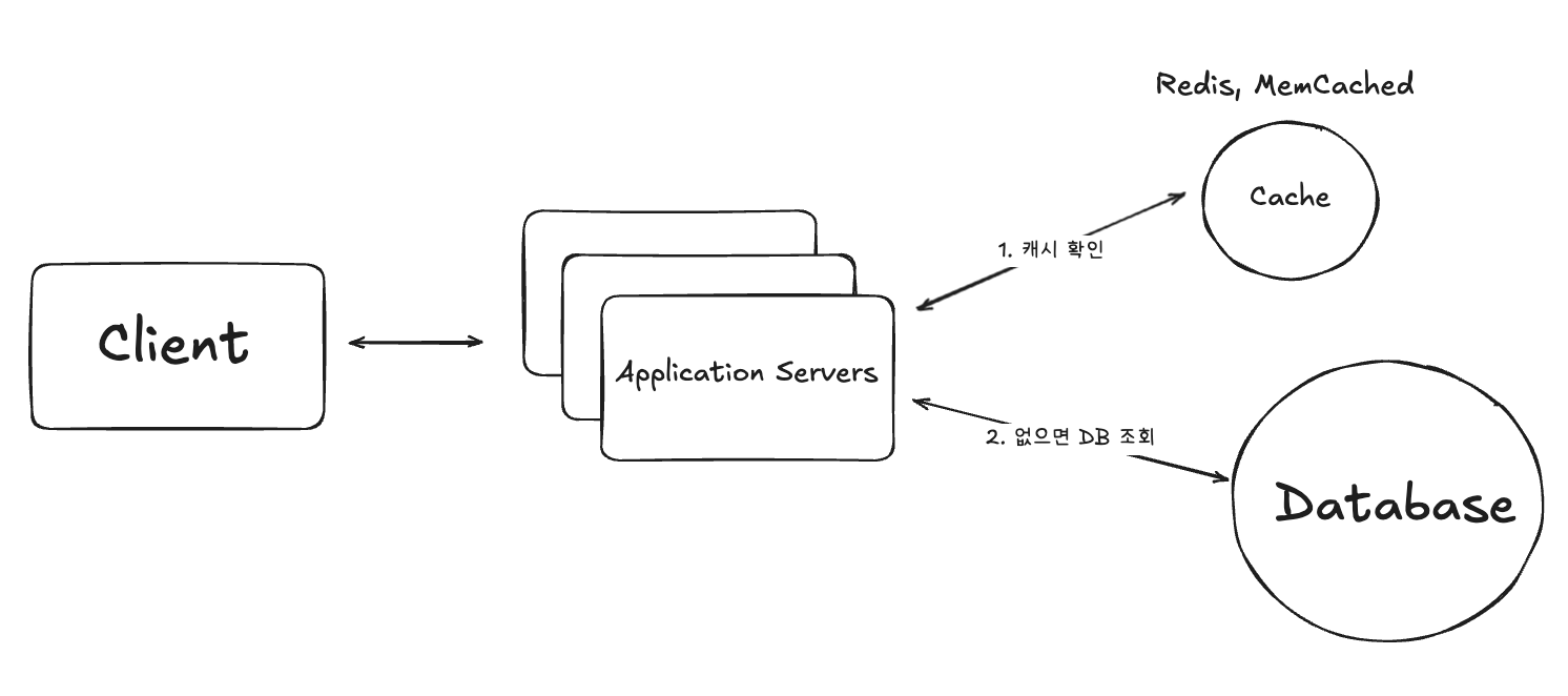 Redis나 MemCached를 통해 자체 서버 및 메모리를 관리하는 DB와 분리된 환경입니다. 보통 Application 서버에서 필요한 데이터를 먼저 캐시에서 찾고 캐시에 데이터가 있는 경우를 캐시 히트라고 하고 바로 가져옵니다. 캐시에 존재하지 않을 경우 캐시 미스라 하고 DB에서 데이터를 가져오고 해당 데이터의 복사본을 캐시 서버에 저장하고 클라이언트로 반환합니다.