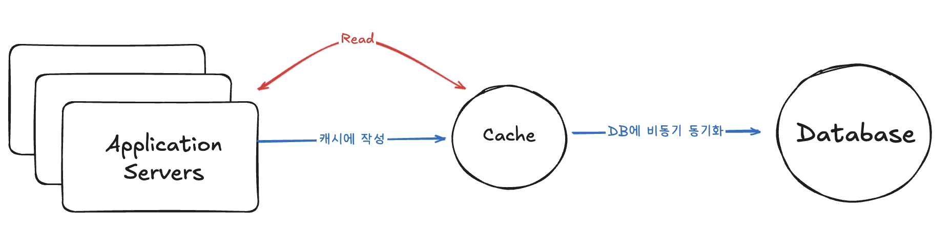 Write-through 방법과 비슷하지만 차이점으로는 Cache에서 DB에 동기화를 할때 비동기로 진행한다는 점입니다.